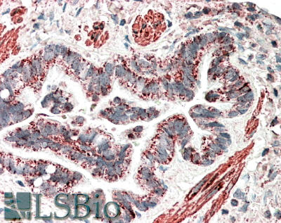 IHC Results In paraffin embedded Human Lung shows staining of smooth muscle cells, vasculature and apical secretory granules in the epithelium of the bronchiole. Recommended concentration: 5-10µg/ml. | |