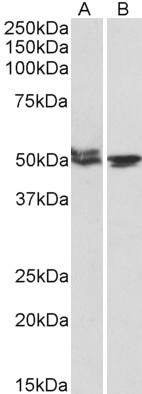 Western Blot Approx 50kDa band observed in Human Lung, Pancreas and Uterus lysates and in Mouse and Rat Testis lysates (calculated MW of 55.5kDa according to NP_001135973.1). Recommended concentration: 1-3µg/ml. | |