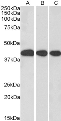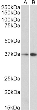 Western Blot Approx 37kDa band observed in nuclear lysates of cell lines HepG2 and NIH3T3 and approx 40kDa band observed in Mouse, Rat and Pig Liver lysates (calculated MW of 37.2kDa according to Human NP_006782.1, Mouse NP_077751.1, Rat NP_001011999.1 and Pig XP_001927776.1 and 41.5kDa according to Human NP_996670.1, Mouse NP_001034236.1 and Pig XP_001927789.1). Recommended concentration: 0.1-0.3µg/ml. | |
