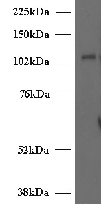 Approx. 105kDa band observed in Human T-lymphocyte and HeLa lysates (calculated MW of 123kDa according to NP_954712.1). Recommended concentration: 1-3µg/ml. Primary incubation was 1 hour.
