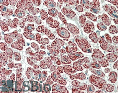 IHC Results In paraffin embedded Human Heart shows mitochondrial staining in cardial fibres. Recommended concentration: 4-8µg/ml. | |