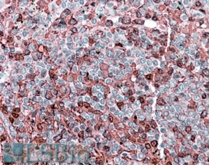 In paraffin embedded Human Spleen shows nuclear membrane and weaker cytoplasm staining in select splenocytes. Recommended concentration, 3-6µg/ml.