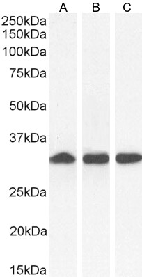 Western Blot Approx. 30kDa band observed in lysates of cell lines U251 and HepG2 and in Human Kidney, Lung and Duodenum lysates, and approx. 30-32kDa band in Rat Kidney, Lung and Duodenum lysates (calculated MW of 30.9kDa according to Human NP_000894.1 and Rat NP_058696.2). Recommended concentration: 0.1-0.3µg/ml. Primary incubation 1 hour at room temperature. | |