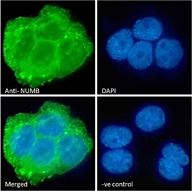 This antibody is expected to recognize all reported isoforms (NP_001005743.1, 001005744.1, NP_003735, NP_001005745.1). It is also likely to cross-react with Numblike (NUMBL, GeneID: 9253) which has a very similar C-Terminus, although this has not yet been tested experimentally.