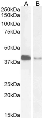 Western Blot Approx 40kDa band observed in lysates of cell lines Jurkat and glioblastoma U251 (calculated MW of 37.4kDa according to NP_058644.1) . Recommended concentration: 1-3µg/ml. Primary incubation 1 hour at room temperature. | |