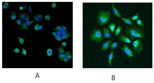 Usage Summary Immunofluorescence: Strong expression of the protein seen around the nucleus. Dividing cells appear to show enhanced expression. Recommended concentration: 5µg/ml. | |