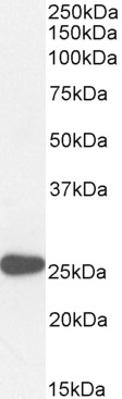 Western Blot Approx 26kDa band observed in lysates of cell lines U251 and RAW264.7 and in nuclear lysates of cell lines K562 and HeLa, all successfully blocked by incubation with the immunising peptide (calculated MW of 24.8kDa according to Human NP_001355859.1 and 31.8 according to Mouse NP_001297075.1). Recommended concentration: 0.03-1µg/ml. Primary incubation 1 hour at room temperature. | |
