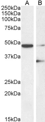 Western Blot Approx 48kDa band observed in Human Liver lysates. An additional 35kDa bamd was also observed in some Liver and HEK293 cell lysates (calculated MW of 34.9kDa according to Human NP_039247.1 PAX8D and 48.2kDa according to Human NP_003457.1 PAXA). Recommended concentration: 0.3-1µg/ml. Primary incubation 1 hour at room temperature. | |