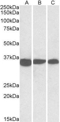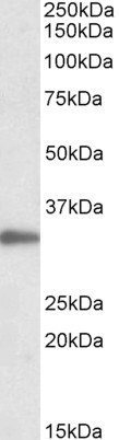 Western Blot Approx 30kDa band observed in lysates of cell line Jurkat (calculated MW of 28.8kDa according to Human NP_002583.1). Approx.35kDa band was observed in lysates of cell line NIH3T3 and in Mouse and Rat Testis, and approx 33kDa in Pig Spleen lysates. (calculated MW of 28.8kDa according to Mouse NP_035175.1, Rat NP_071776.1 and Pig NP_001278854.1).The observed molecular weight corresponds to earlier findings in literature with different antibodies (Gilljam et al, , J Cell Biol. 2009 Sep 7;186(5):645-54.). Recommended concentration: 0.03-0.1µg/ml. | |