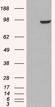 Western Blot In transfected HEK293 transiently expressing PDE5A isoform 2 a band of approx. 95kDa is observed. This band is not observed in the non-transfected HEK293 (calculated MW of 94.8kDa according to isoform 2, NP_236914.2). Recommended concentration: 0.3-1µg/ml. | |