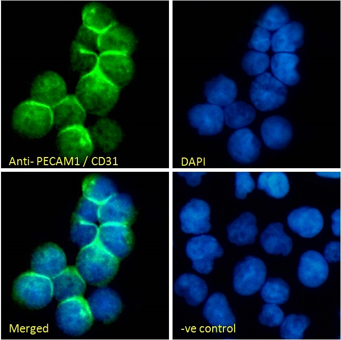 Usage Summary Immunofluorescence: Strong expression of the protein seen in the cell junctions/ PM of Jurkat cells. Recommended concentration: 10µg/ml. | |