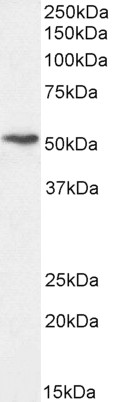Western Blot Approx 55kDa band observed in Human Breast and Breast cancer lysates, and in lysates of cell line Jurkat (calculated MW of 56.0kDa according to NP_002657.3). Recommended concentration: 0.5-2µg/ml. Primary incubation 1 hour at room temperature. | |
