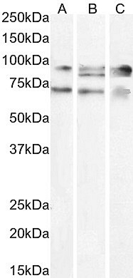 Western Blot Approx. 70+90kDa bands observed in lysates of cell line A431 and in nuclear HEK293 cell lysates, and an additional 85kDa band observed in HepG2 cell lysate (calculated MW of 91.0kDa according to NP_037393.1, 89.6kDa according to NP_001317681.1, and 77.1kDa according to NP_001317682.1). All bands were successfully blocked by incubation with the immunizing peptide. Recommended concentration: 1.5-3µg/ml. Primary incubation 1 hour at room temperature. | |