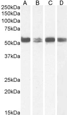 Western Blot Approx 55kDa band observed in Mouse Ovary lysates and in lysates of cell line NIH3T3, K562, KNRK and Nuclear Jurkat (calculated MW of 57.2kDa according to Human NP_114368.1 and 56.9kDa according to Mouse NP_032982.2 and Rat NP_071961.2). Recommended concentration: 0.001-0.01µg/ml. Primary incubation 1 hour at room temperature. | |