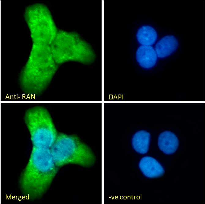Immunofluorescence: Strong expression of the protein seen in the cytoplasm and nuclei of A431 cells. Recommended concentration: 10µg/ml.