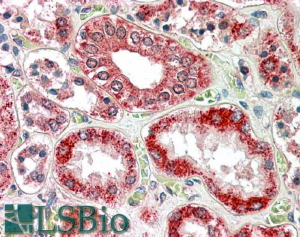 IHC Results In paraffin embedded Human Kidney shows pixulated cytoplasm staining in DCT. Recommended concentration: 3-5µg/ml. | |