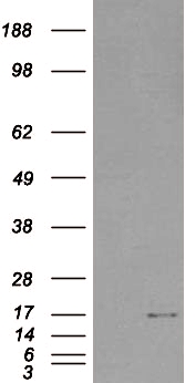 Western Blot Approx 16kDa band observed in Human Thymus lysates (calculated MW of 14.2xkDa according to NP_002342.1). In transfected HEK293 transiently expressing SH2D1A a band of approx. 16kDa is observed. This band is not observed in the non-transfected HEK293. Recommended concentration: 0.3-1µg/ml. | |