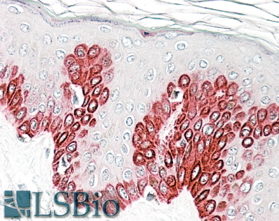 IHC Results In paraffin embedded Human Skin shows perinuclear staining in select keratinocytes. Recommended concentration, 3-5µg/ml. | |