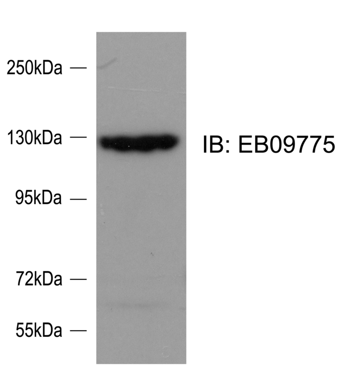 Western Blot Approx 124kDa band observed in lysates of cell line HeLa and in rat primary culture cortical neurons at Day 4 (calculated MW of 121kDa according to human NP_056141.2 but the rat protein sequence is stlll provisional). Recommended concentration: 0.1-0.3µg/ml. | |
