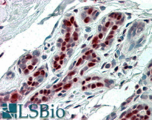 IHC Results In paraffin embedded Human Breast shows nuclear staining in lobular cells. Recommended concentration: 3-5µg/ml. | |