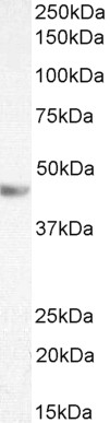 Approx. 45kDa band observed in lysates of cell line Jurkat and in Human Cerebellum lysates and approx. 48kDa in Hippocampus lysates (calculated MW of 44.7kDa according to NP_031401.1). Recommended concentration: 0.3-1µg/ml. Primary incubation 1 hour at room temperature.