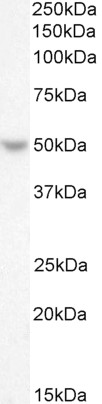 Approx. 48kDa band observed in nuclear lysates of cell line NIH3T3 and approx. 50kDa in Human Ovary lysates, and in preliminary testing of Human Placenta lysate (calculated MW of 49.5kDa according to Human NP_758438.2 and Mouse NP_694794.1). Recommended concentration: 1-3µg/ml. Primary incubation 1 hour at room temperature.
