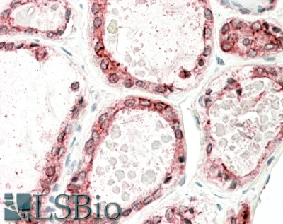 IHC Results In paraffin embedded Human Thyroid Gland shows textured staining in the cytoplasm of epithelial cells. Recommended concentration, 5-10µg/ml. | |