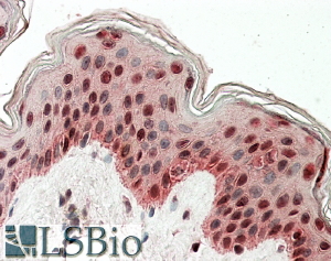 In paraffin embedded Human Skin shows staining of select keratinocytes. Recommended concentration, 3-5µg/ml.