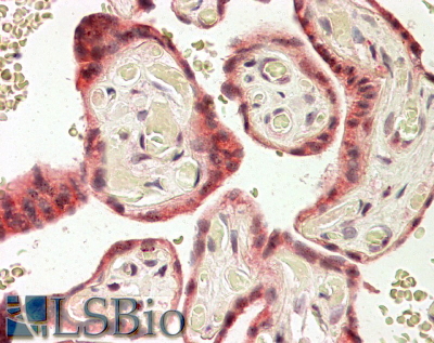 In paraffin embedded Human Placenta shows membranous staining in the cytotrophoblasts. Recommended concentration, 3-4µg/ml.