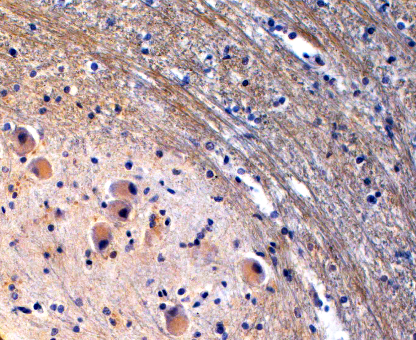 In paraffin embedded Human Brain Stem shows staining of the cytoplasm of Purkinje cells and of neuron projections. Recommended concentration, 2-4µg/ml.