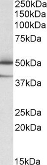 Western Blot Approx 50+38kDa bands observed in Human Lymph Nodes lysates (calculated MW of 47.6kDa according to NP_110437.2 and of 36.2kDa according to NP_001139021.1). A 48kDa band was observed in Mouse Lymph Node while a 37-38kDa doublet was observed n Mouse Stomach lysates and in Mouse Intestine lysates. Recommended concentration: 0.03-0.1µg/ml. Primary incubation was 1 hour. | |