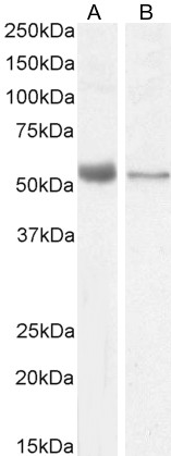 Western Blot Approx 55kDa band observed in Human Placenta and Duodenum lysates and approx. 55-60kDa in lysates of cell line U937 (calculated MW of 55.2kDa according to NP_001351014.1). Recommended concentration: 2-3µg/ml. Primary incubation 1 hour at room temperature. | |