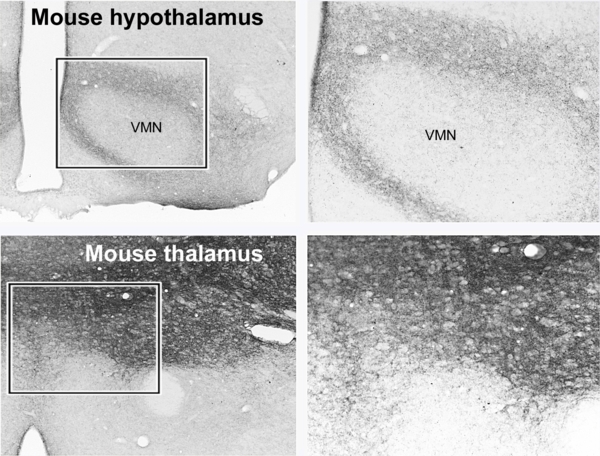In paraffin embedded Mouse Brain shows staining of the periphery of the ventromedial nucleus in the hypothalamus Recommended concentration: 0.3-1µg/ml. | |