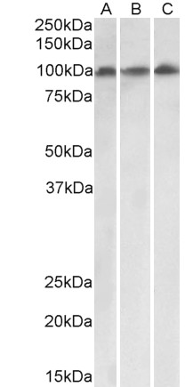 Approx 100kDa band observed in lysates of cell lines HepG2, HeLa and Jurkat and in lysates of Mouse Spleen and Rat Thymus (calculated MW of 94.7kDa according to NP_072097.2). Recommended concentration: 0.1-0.3µg/ml. Primary incubation was 1 hour.
