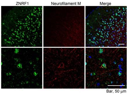 Western Blot Approx 28kDa band observed in Mouse embryo and adult Brain lysates (right panel), consistent with the observed band in transfected N2a cells transiently expressing Znrf1(left panel) Calculated MW of 23.8kDa according to NP_573469.1. Recommended concentration: 1-3µg/ml. Data obtained from Dr. Shuji Wakatsuki, National Institute of Neuroscience, Tokyo, Japan | |